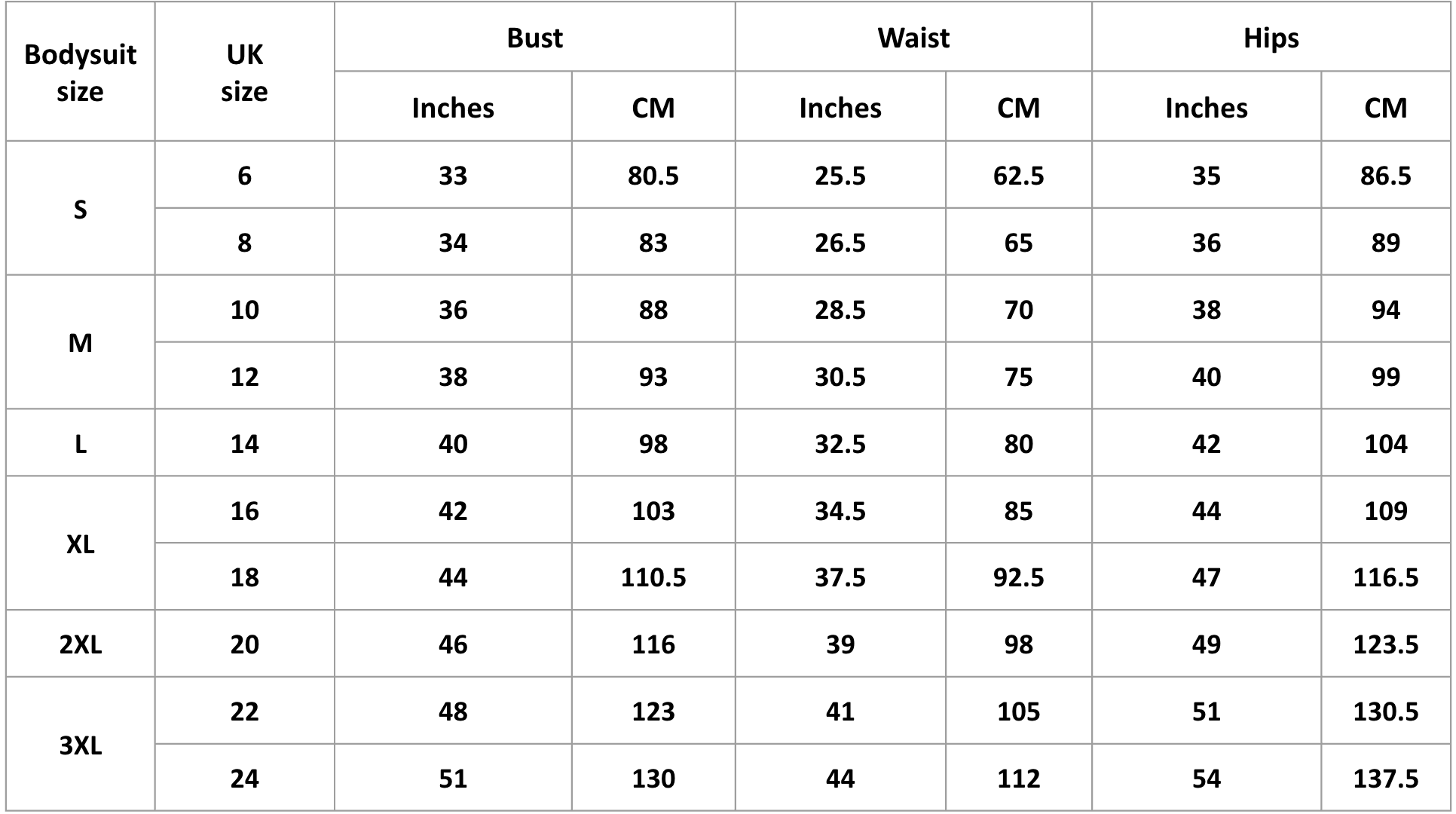 Bodysuit material: 82% Polyester 18% Lycra. True to size. Material is stretchy and soft. Recommend hand washing due to logo printing and possible colour running.